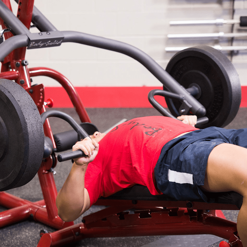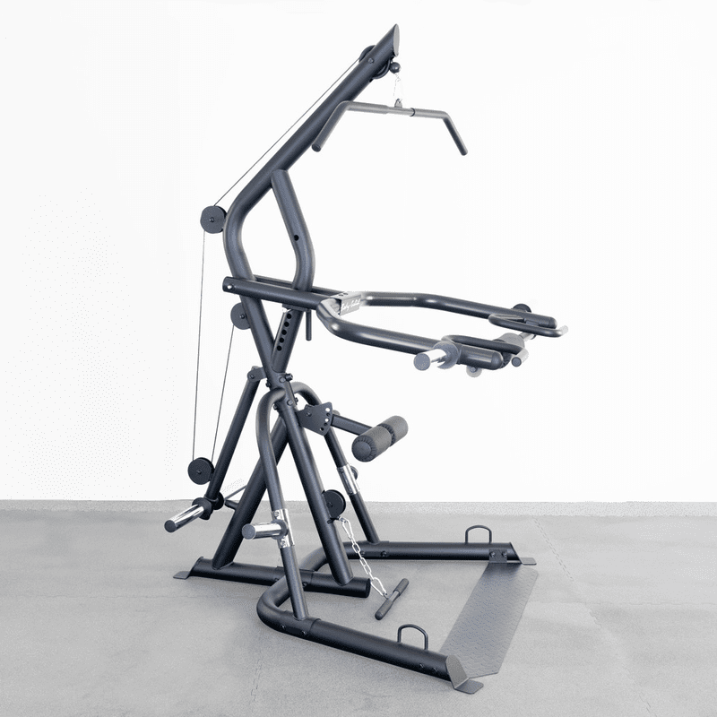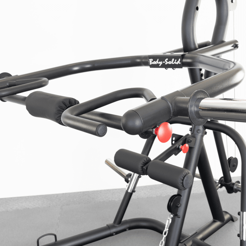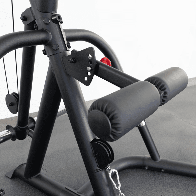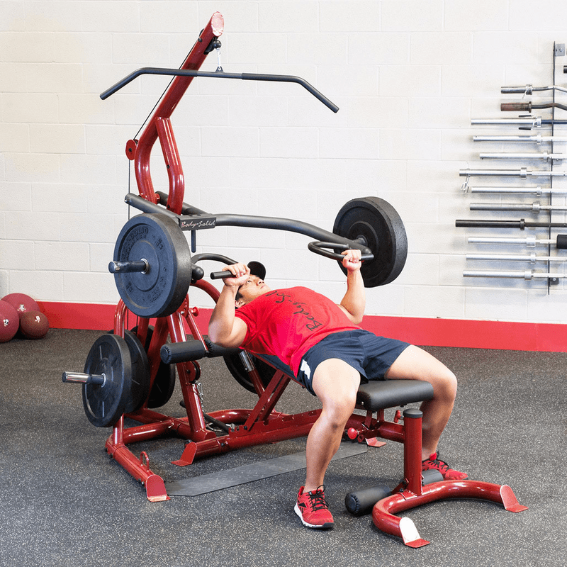 The swing arm/press arm station has a large radius to greater simulate a straight up and down motion. The press arm bar can also be raised to its highest position allowing the GLGS100B to be used as a pull-up/chin-up station. An adjustable knee lock-down makes lat pulldowns easier than ever while the low pulley station is perfect for curls and multiple row exercises. Attached weight horns make weight storage easy.