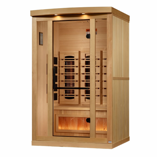Golden Designs “2025” Full Spectrum 8000 Reserve Series with Himalayan Salt is constructed of 100% Canadian Hemlock Fir and easily assembled by two adults. Heating panels feature PureTech™ Heating Technology that uses NEAR, MID and FAR wavelengths to deliver full spectrum heat while maintaining a near zero EMF standard.