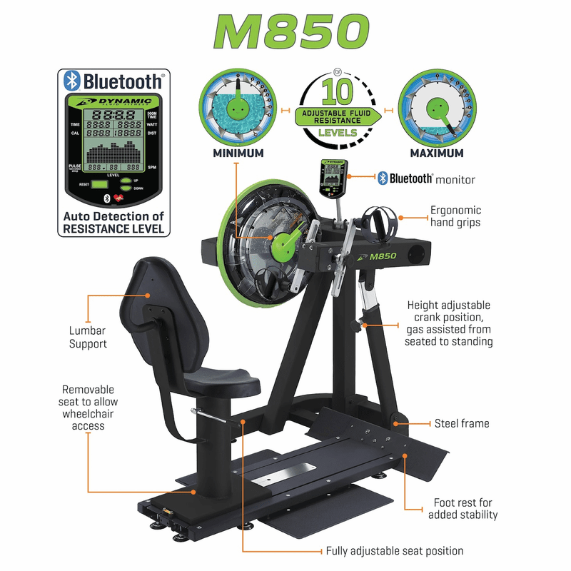 The Dynamic Fluid Exercise M850 UBE (Upper Body Ergometer) is a high quality, heavy duty commercial bidirectional arm cycle for both standing and seated positions.